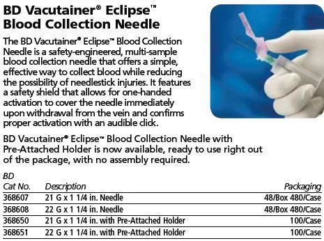 This product combines the easy-to-use BD Vacutainer Eclipse needle with the added convenience of a single-use holder.