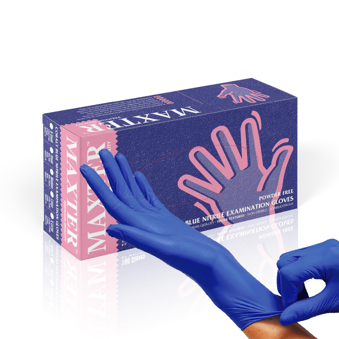 Maxter Blue Nitrile Powder Free Gloves are a premium quality Nitrile examination glove that offers greater tensile strength and protection than both Latex and Vinyl. Comes in a box of 200, powder free nitrile gloves..